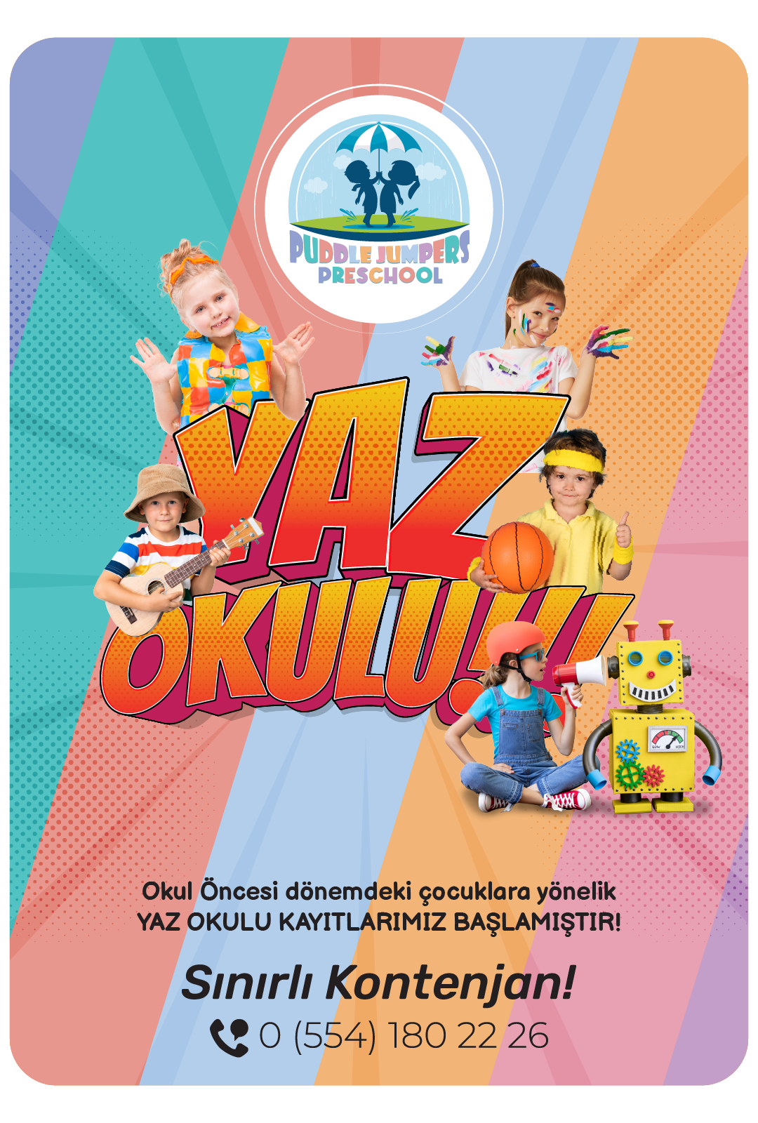 Puddle Jumpers Preschool olarak, çocuklarımızın yaz tatilini eğlenceli ve öğretici bir şekilde geçirmeleri için kapsamlı bir yaz okulu programı sunuyoruz.